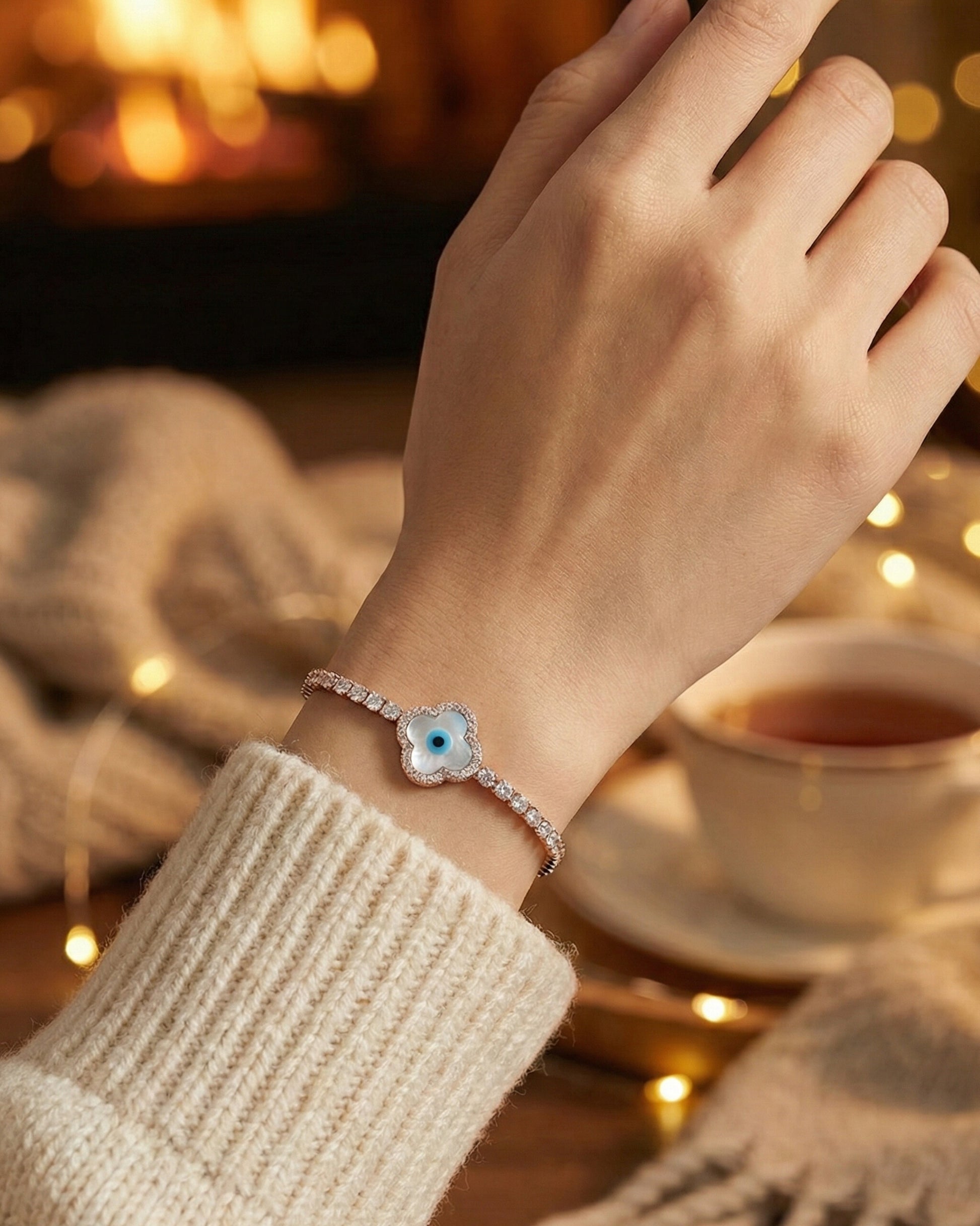 "Your new daily essential. ✨ Shield your energy and attract good vibes with the Mystic Bloom bracelet. Featuring a mother-of-pearl finish and a fully adjustable slider fit. Stack it or wear it solo for an effortless glow."