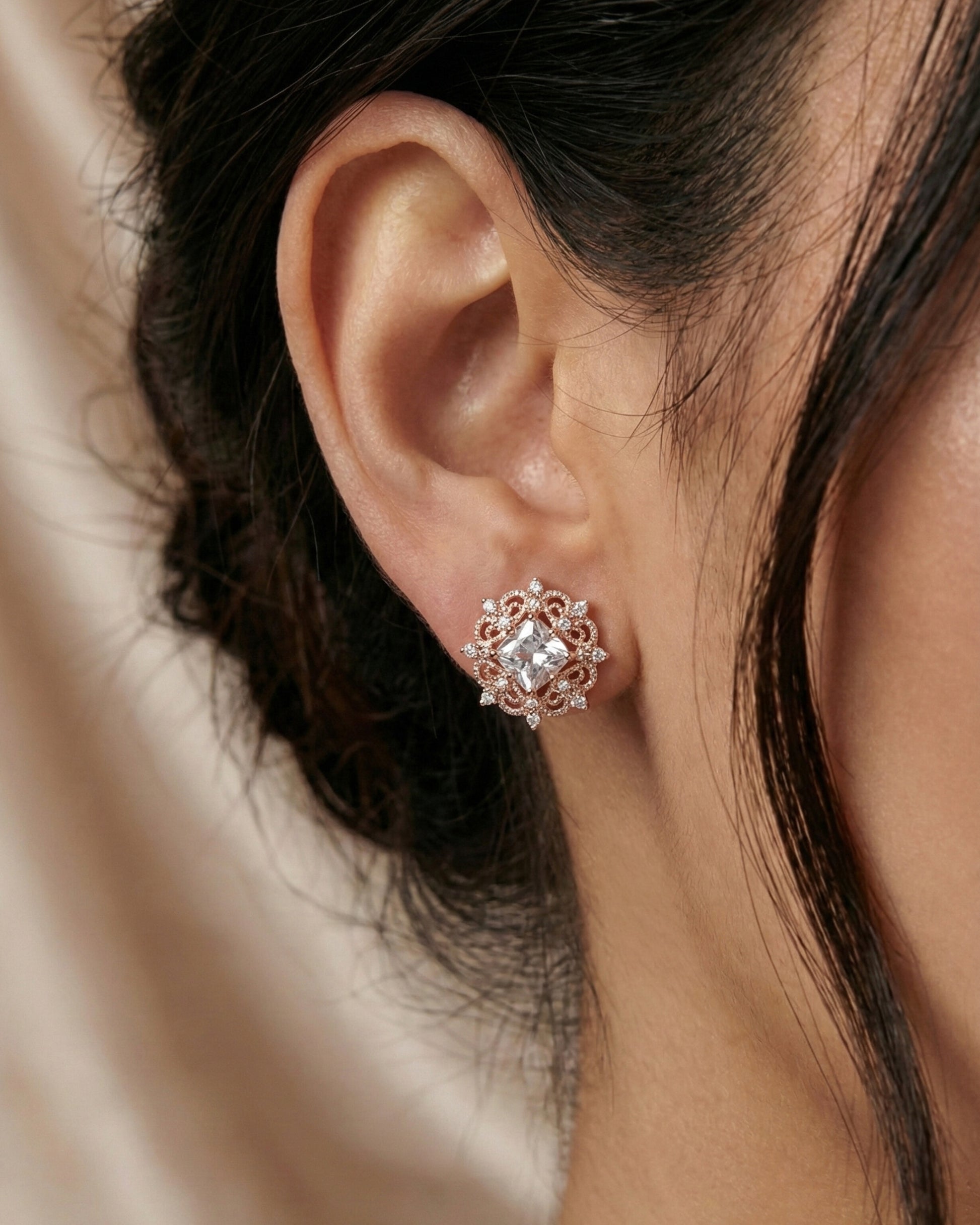 Capture the charm of a bygone era with our Majestic Mosaic Stud. These exquisite studs feature a captivating vintage-inspired design, centered around a brilliant princess-cut crystal set in a diamond orientation. The center stone is framed by an intricate, lace-like halo of rose gold filigree, studded with delicate micro-crystals for added shimmer. Perfectly sized to make a statement without weighing you down, these earrings bring a touch of royal elegance to both everyday wear and special occasions."